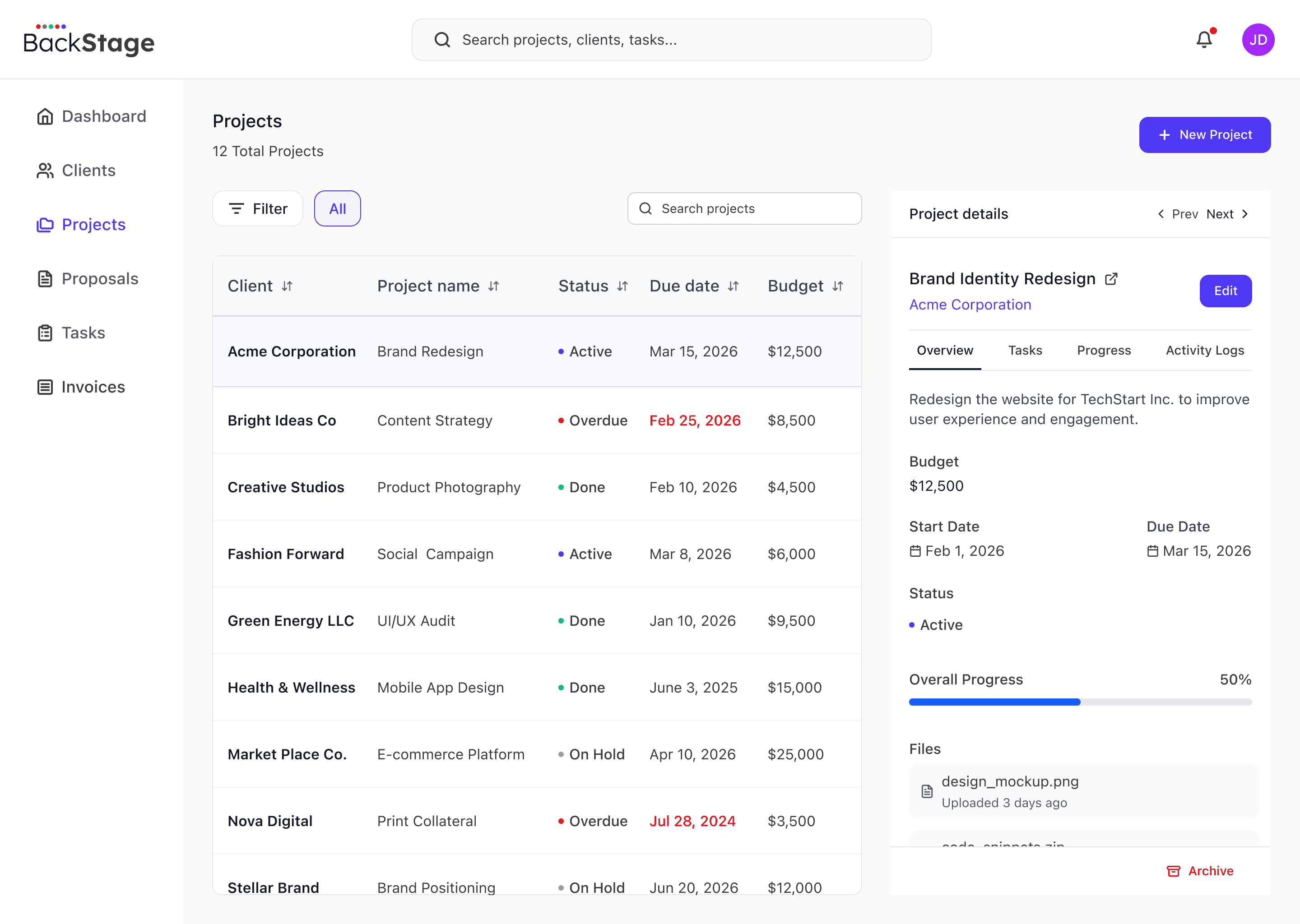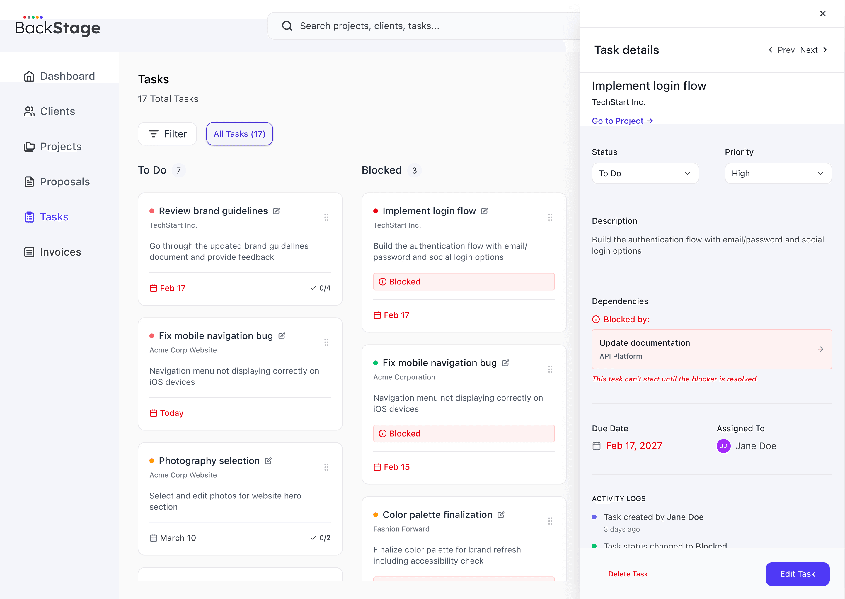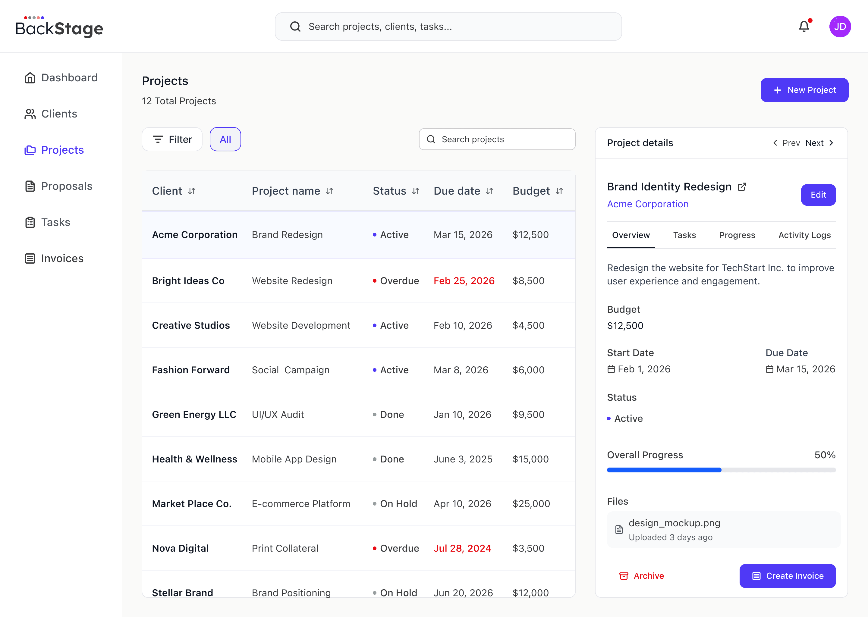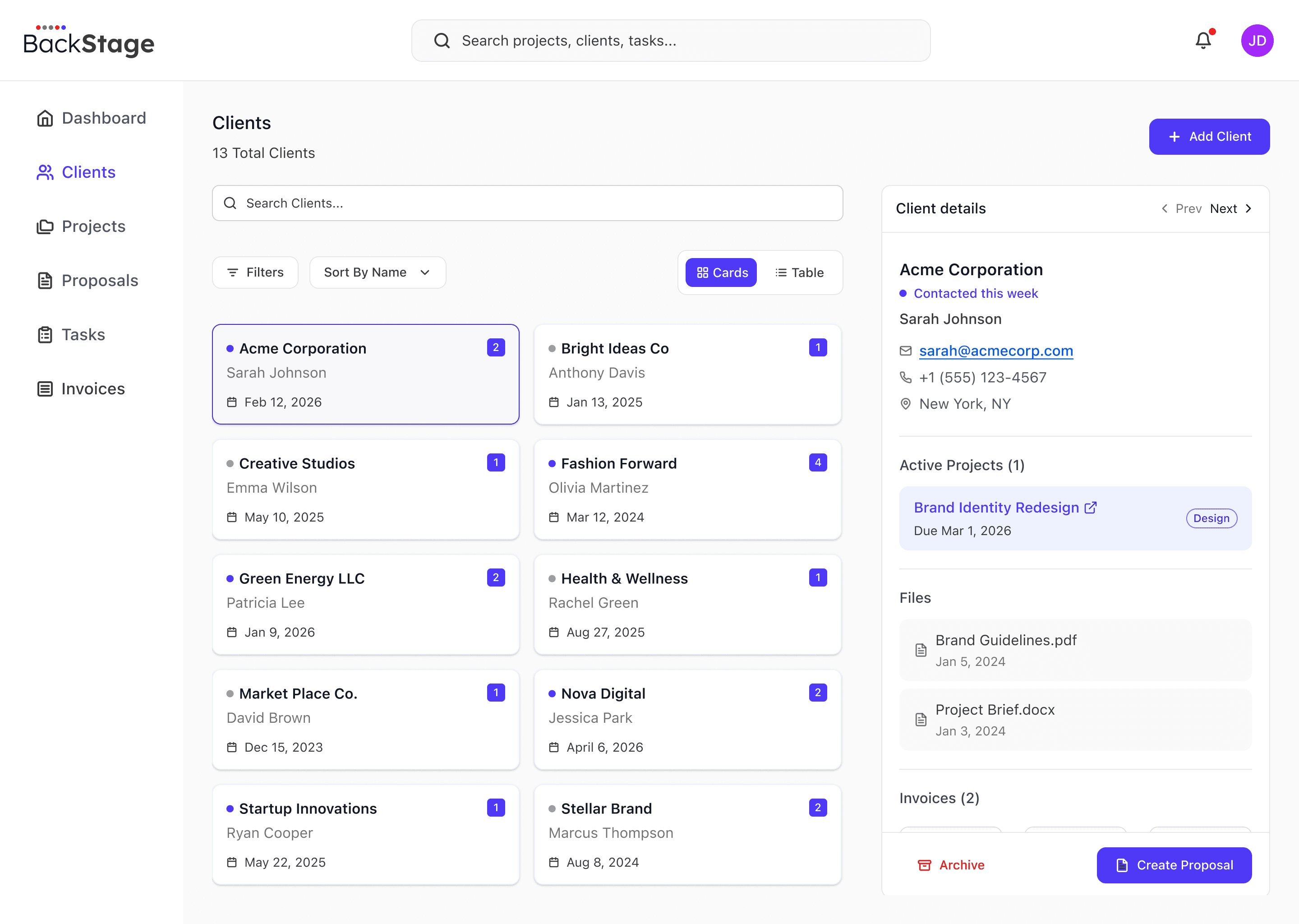 Projects connect to tasks, invoices, and client context.