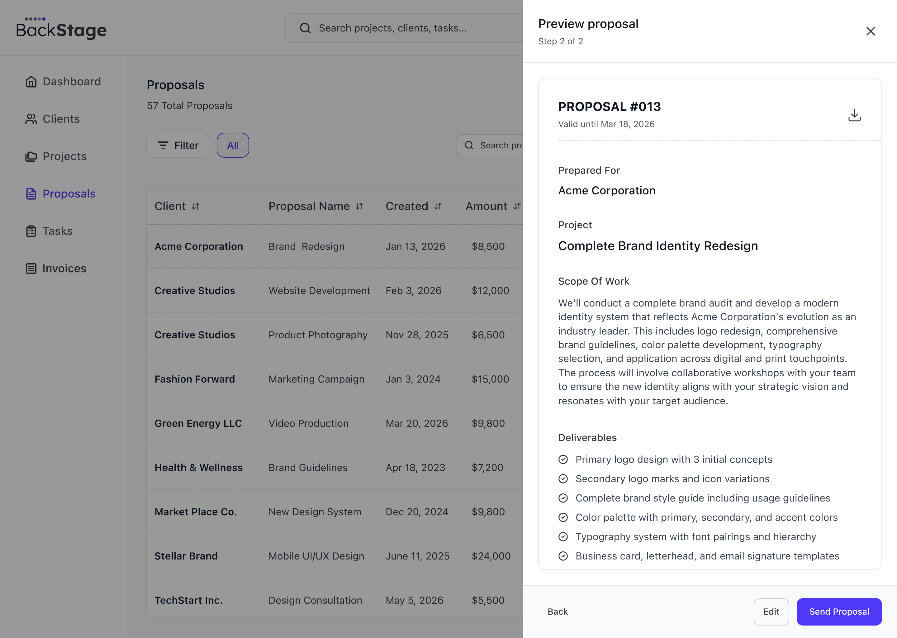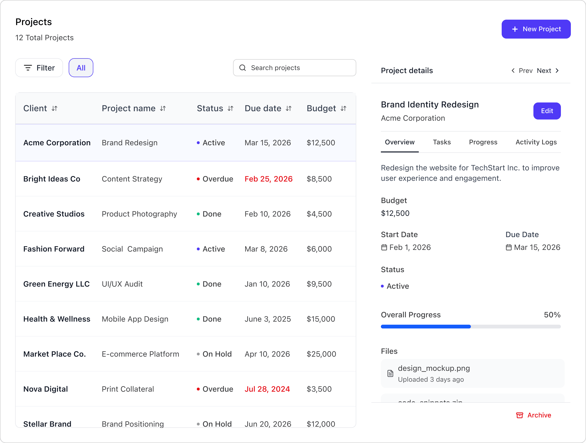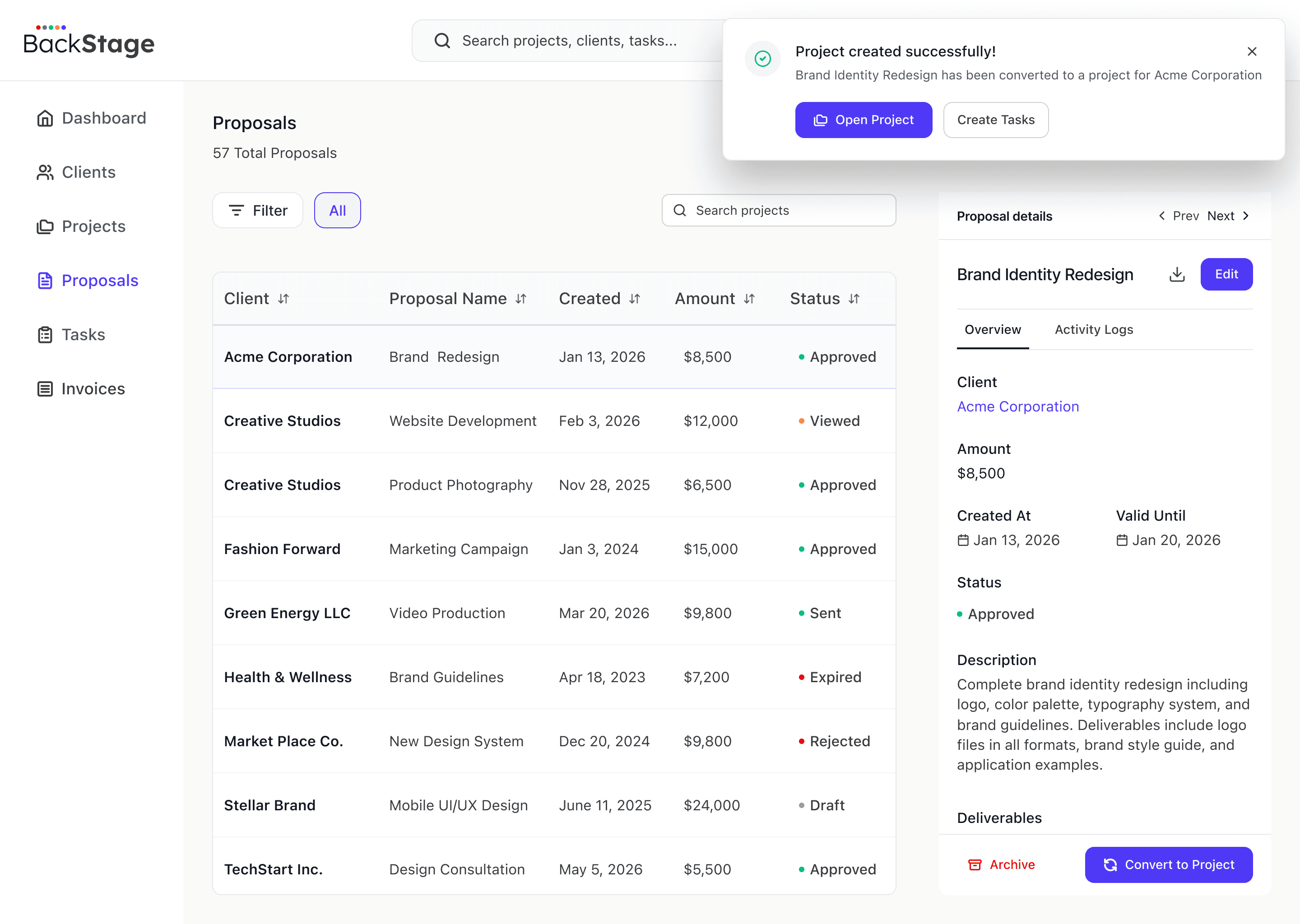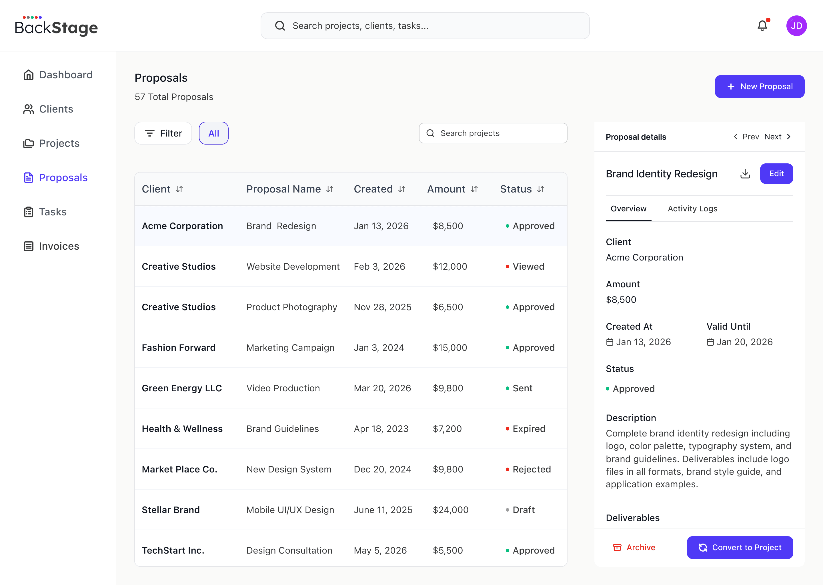 Track all updates across clients, projects, and proposals in one unified timeline view.