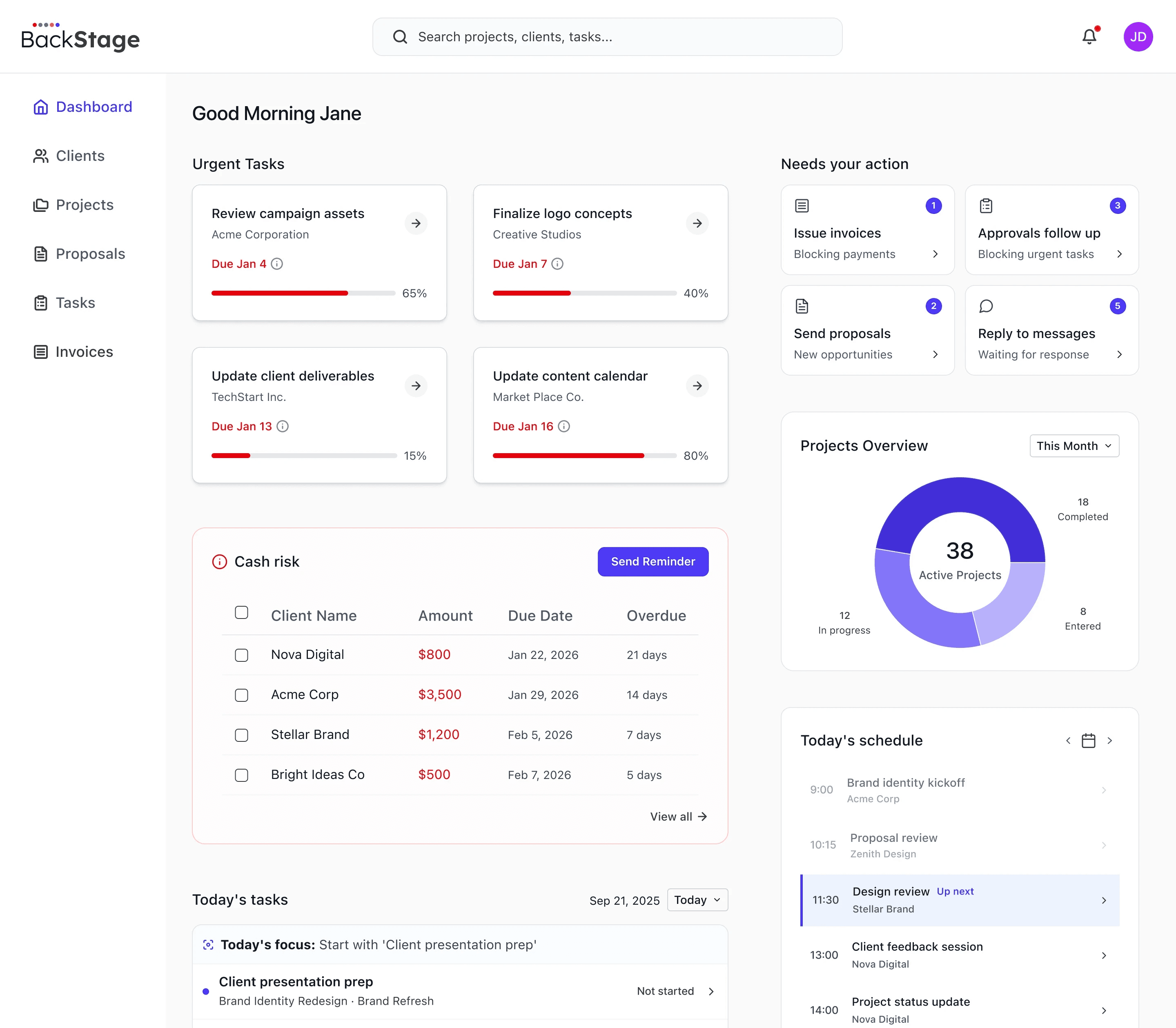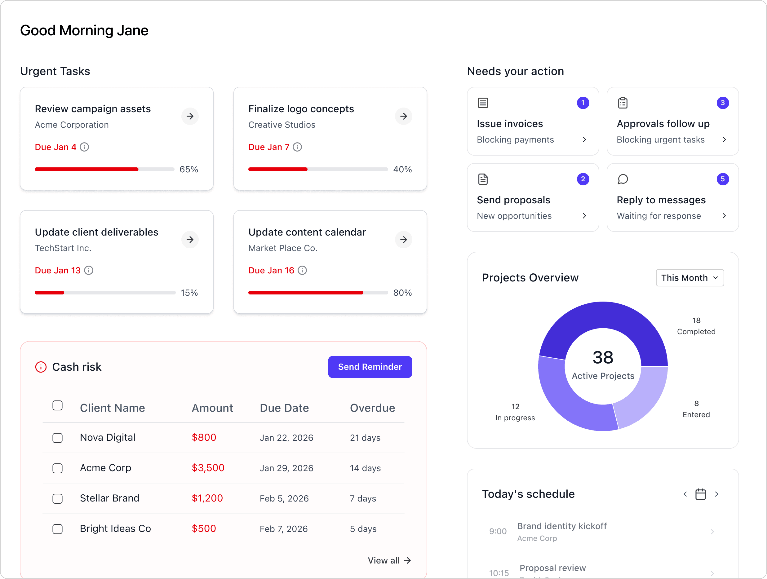 Urgent tasks, deadlines, and risk signals are surfaced immediately.