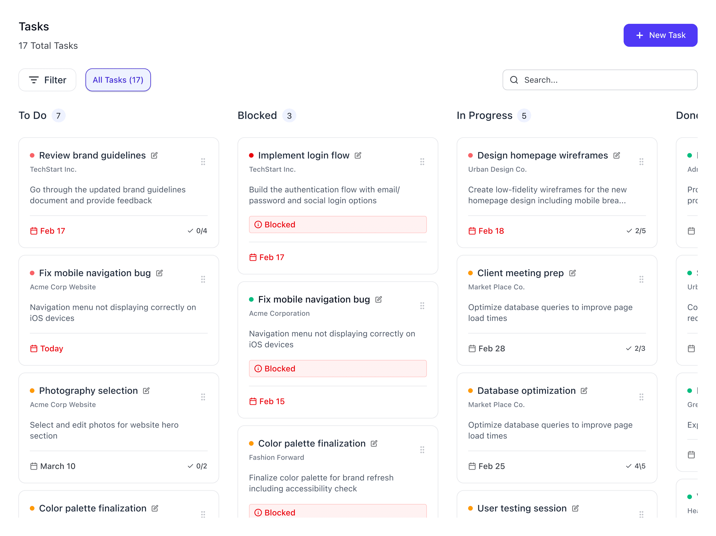 Move tasks across clear columns (To Do, Blocked, In Progress, Done) to track progress instantly.