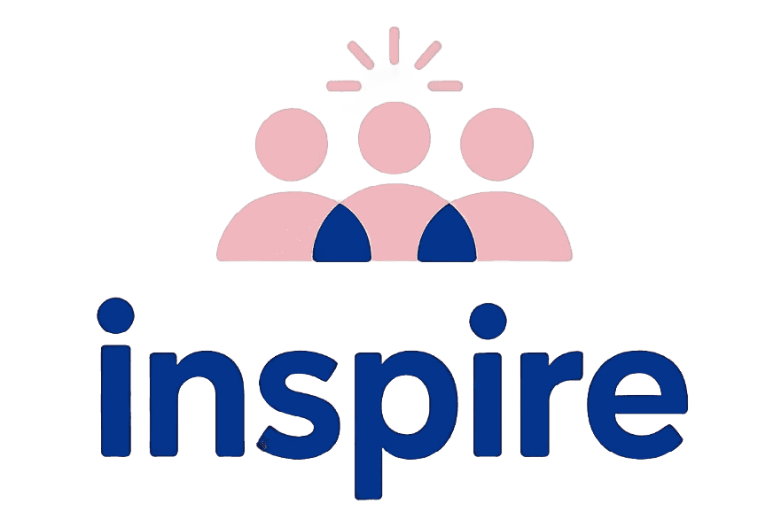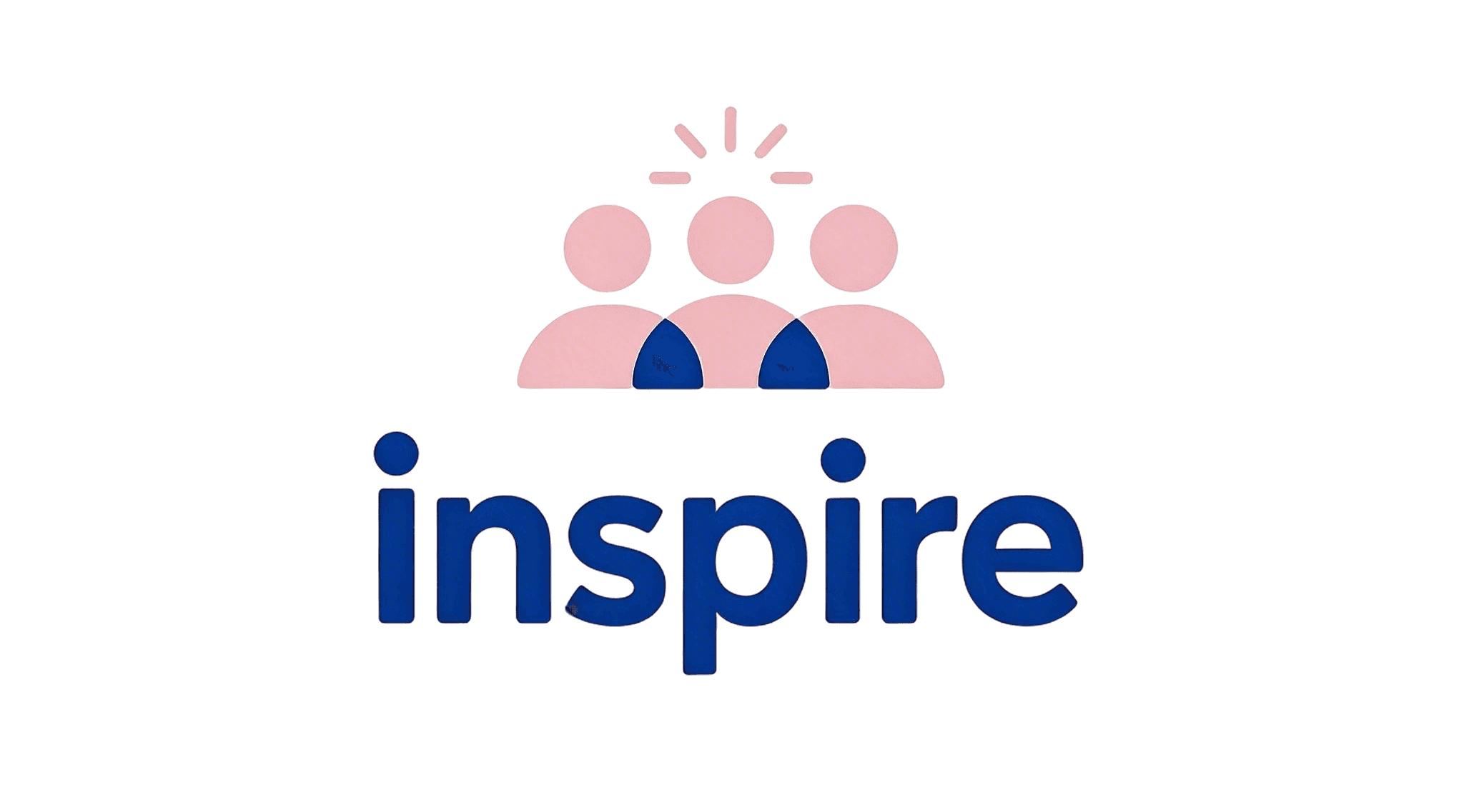 The Inspire logo reflects the brand’s core values of community, inspiration, and action. The three figures symbolize people coming together to share ideas, while the spark represents creativity and fresh thinking. The soft pink and bold blue create a balance between warmth and professionalism.