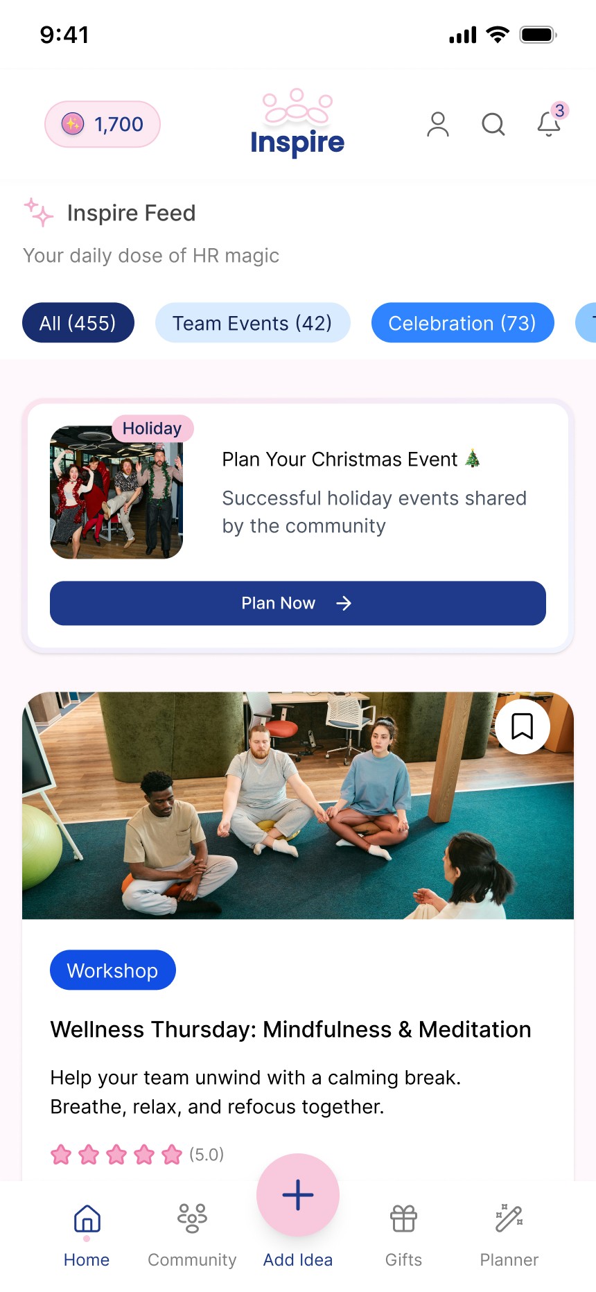 These color-coded event tags enable fast scanning in the feed, helping HR professionals quickly identify relevant ideas by category.